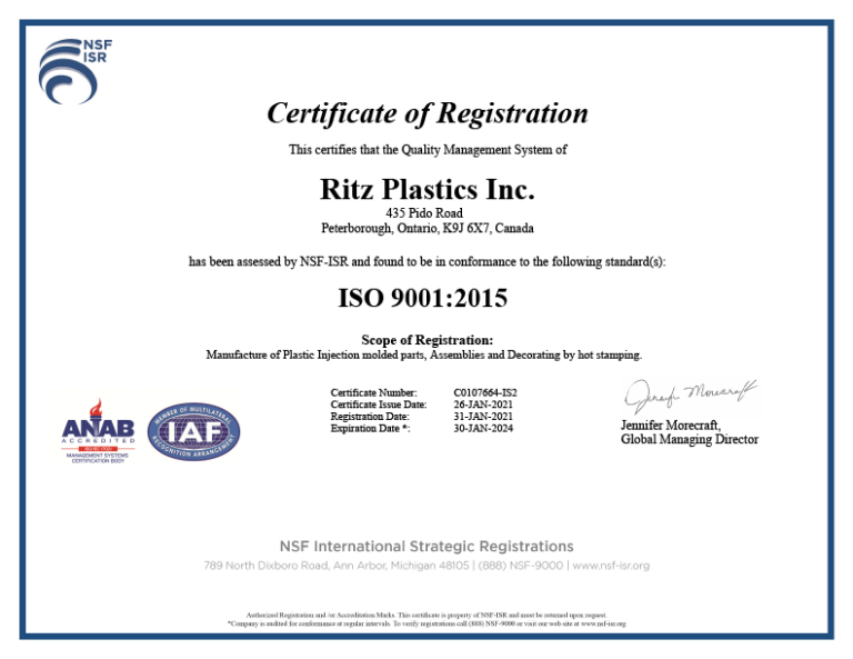 Ritz Plastics understands that quality comes not only from state-of-the-art technology and skilled craftsmanship, but also from developing, maintaining and constantly improving our quality edge in all our manufacturing and business processes from initial order to final delivery.